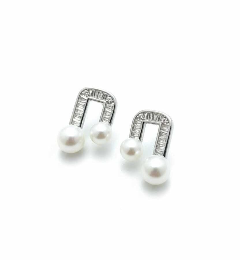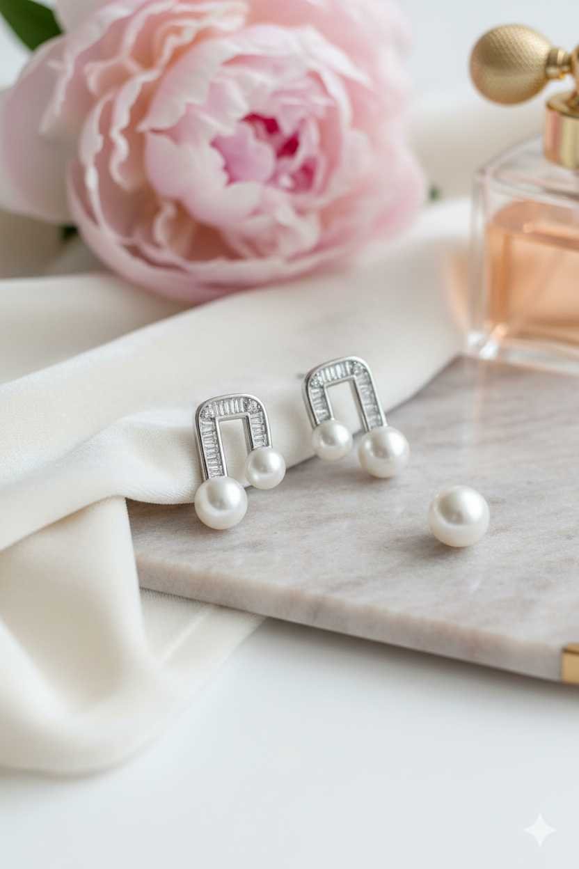 • Asymmetrical Drop: Suspended beneath the crystalline arch are two luminous pearls of slightly varying sizes, creating a sophisticated, asymmetrical double-pearl dangle effect.